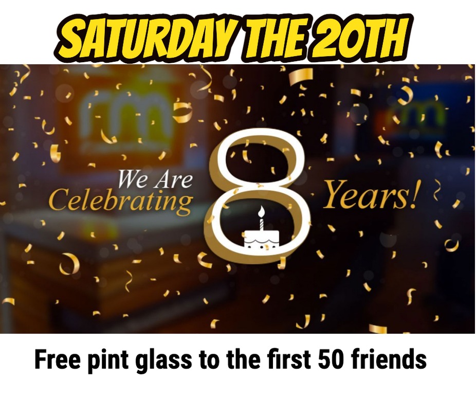 Join us for our 8th year Anniversary!! Free commemorative glass to our first 50 friends!!